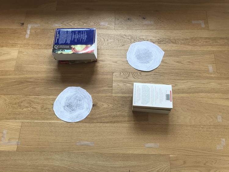 With your two pieces of paper, draw a couple of circles about 8" in diameter and cut them out. Then, shade around the edges with a pencil, and shade more deeply in the middle to make it darker. Then set up your table like this (the tape is the "table" boundary):