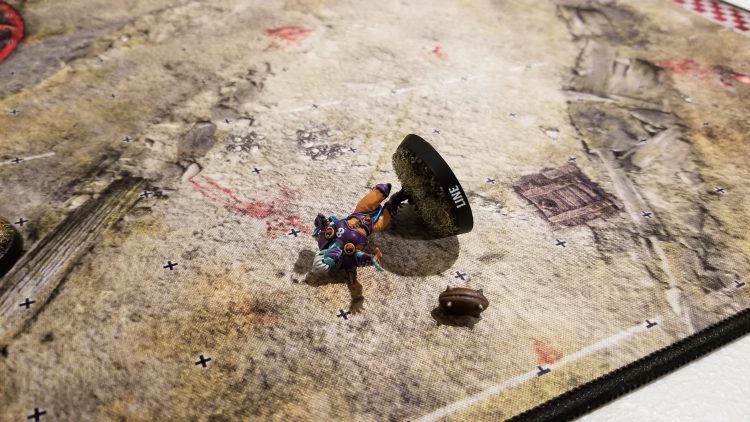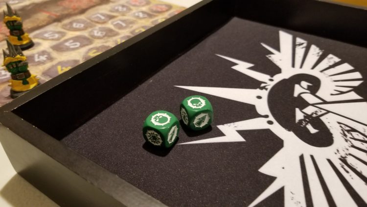 Blocks and Blitzes are executed by rolling special d6s called Block Dice. Instead of pips, they have symbols on them to represent what happens during the Block action. Not to get too granular, but little explosion symbols (or “pows” as we call them) are good, and skulls are bad. Players that are involved in Blocks or Blitzes can get knocked out or injured as a result of that dice roll, and may or may not come back to the game in later drives. So, later turns tend to go a lot quicker as teams lose coaches to injury or death during the course of the game.
