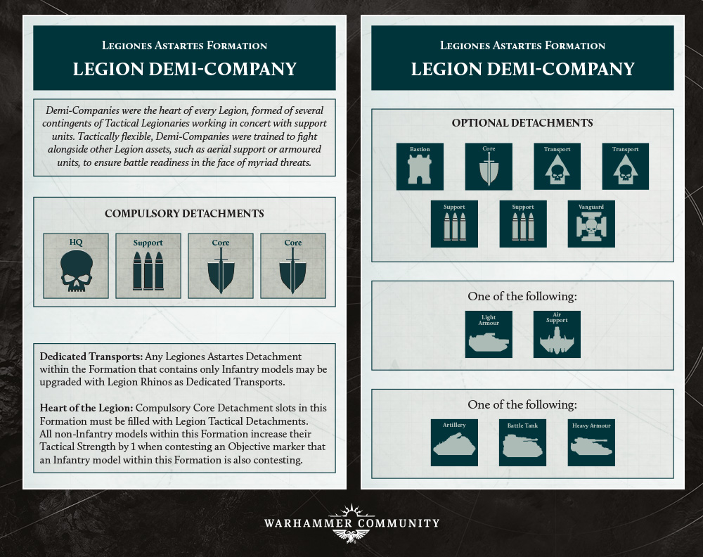Detachments, which operate independently. A Formation will have a number of compulsory Detachments and also some optional ones you can add. So for example a Legion Demi Company is a Formation that includes a minimum of a HQ Detachment, two Tactical Detachments (each of 20+ Legionaries) and a Support Detachment that can be all kinds of things. Then you cna optionally add a wide variety of other units if you want, or start again with a new Formation.
