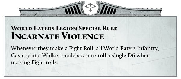 The Incarnate Violence perpetrated by World Eaters Infantry, Cavalry and Walkers lets them reroll one of the dice in a combat. You roll 2D6 in a fight and compare it to your opponent’s score to see who wins, adding in your model’s Close Assault Factor. This reroll is going to change the result of fights pretty often.