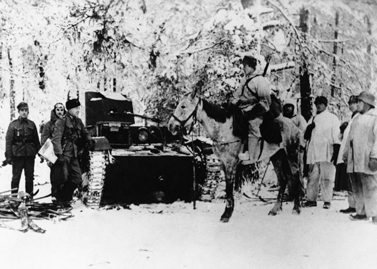Finnish soldiers inspect a captured Soviet tank during the Winter War.
