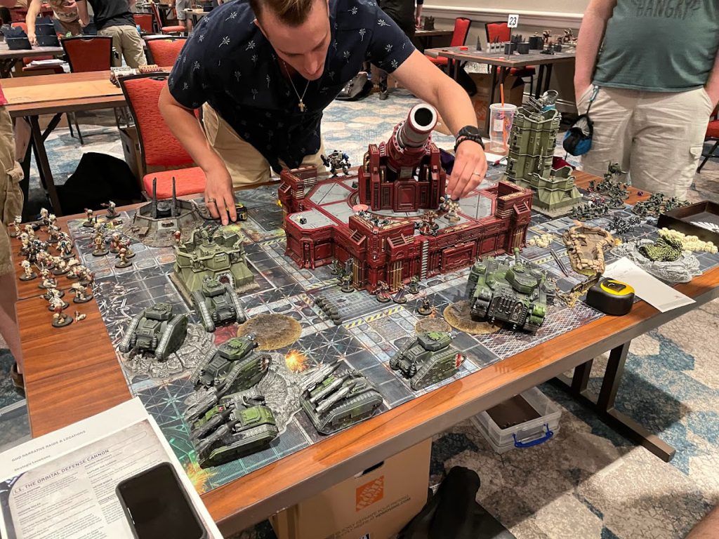 Warzone: Nephilim. A 6-round slobberknocker where three teams of 8 Warhammer players (Imperium, Chaos, and Xenos) fought over resources to help their teams win more games or apply debuffs to other teams for their games. One such resource was a BIG GUN!
