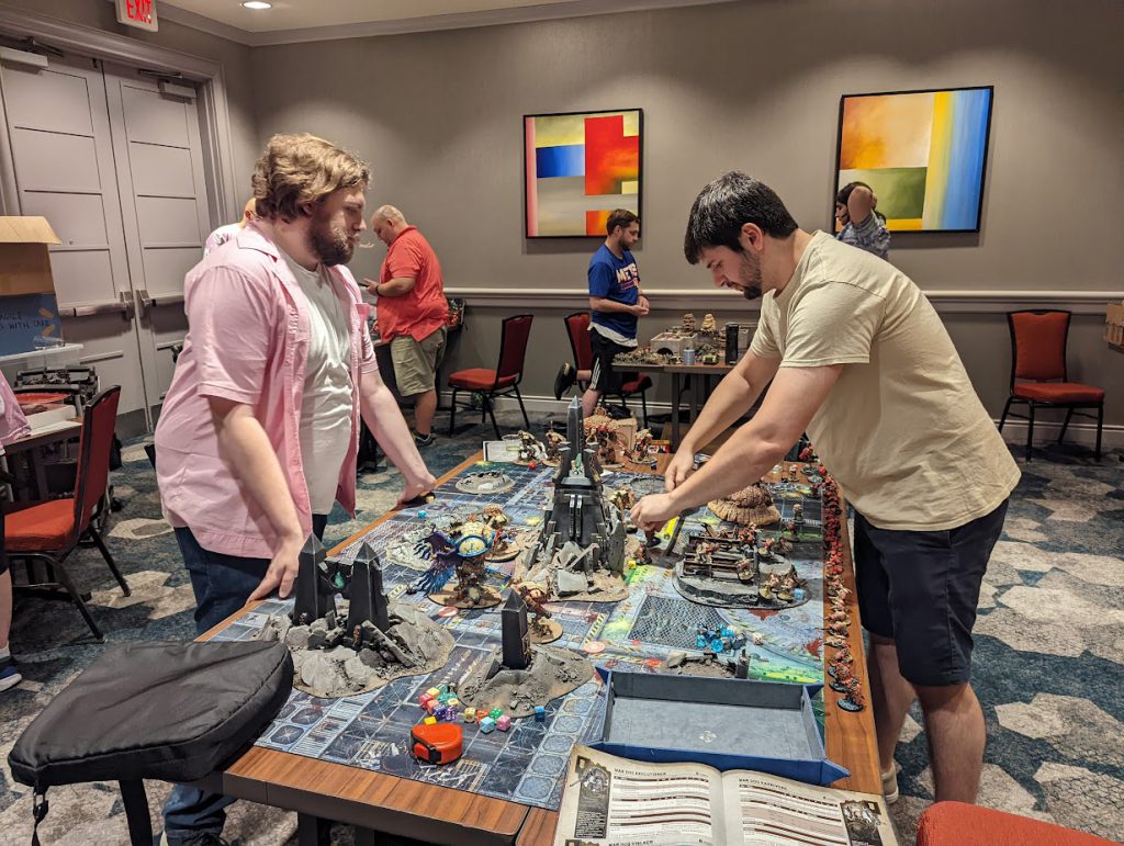 I loved the event. I got to play against friends all day and hang out and socialize with them all night. Absolute banger of a vacation weekend for me. I had a really great time playing against all of my opponents. On the first day I played against Craftworld Ulthwe Aeldari, Drukhari, and Bork’an T’au. The highlight of these games being the 1,000pt fight against Bor’kan. We had to protect data points distributed between our units. He gained a lot of victory points by actually performing the mission action and transferring data points to his characters. I simply played “slaughter the T’au”. Being White Scars I had a great time soaking up shots from his Hammer Head and charging with my Vanguard Veterans headfirst into his commander. My Gravis Captain also put in his work to bust up a squad of pathfinders in one-fell swoop.