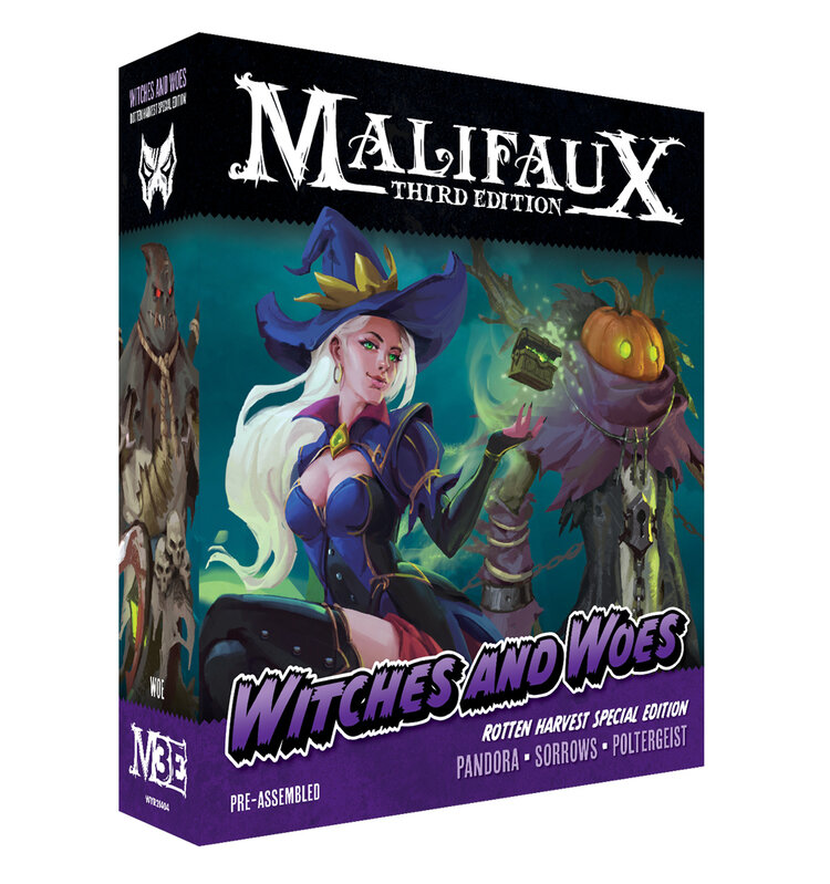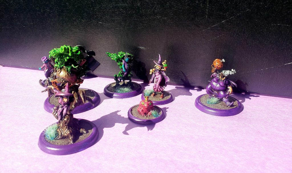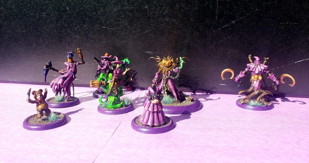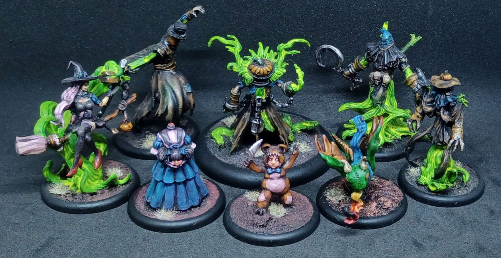 The first Rotten Harvest crew, released in 2020, was Pandora's. As you can see, Witches and Woes has a distinctly bewitching vibe, in that Pandora appears to be cosplaying Samantha Stevens. (At least, that was my ride, but she's distinctly, uh, fancy relative to Samantha). She's got her pumpkin-headed helpers, and Candy, Kade and Iggy showed up in adorable little Halloween costumes as add-ons. The models are pretty high-quality, and if you're the type who likes to field the Carver, he fits right in here.