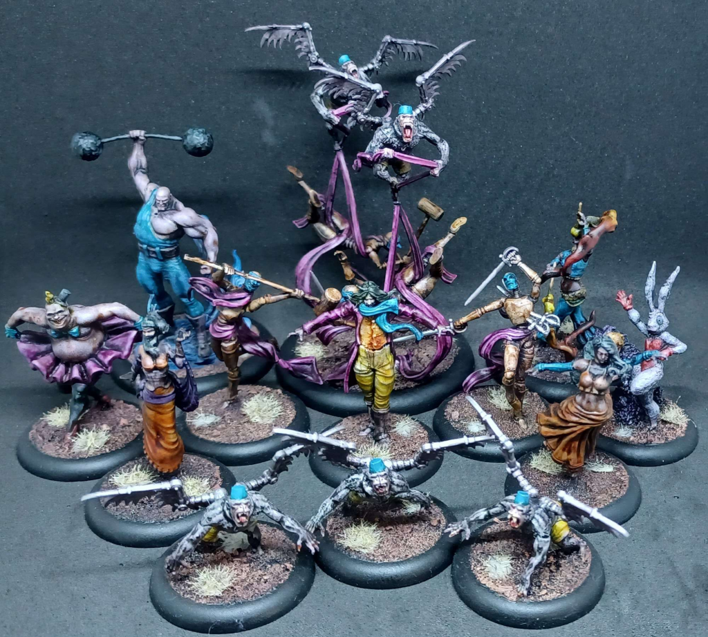 Malifaux has always had a particularly baroque horror aesthetic, so I think a dark carnival fits here a bit more than it might in other systems - it feels less shoehorned in. The Coryphee mannequins are popular to this day, since they look pretty cool when placed on the same base to function as a Duet.