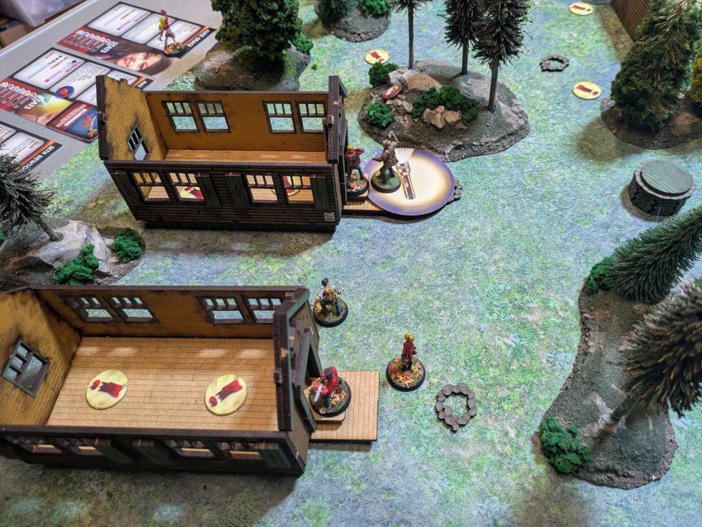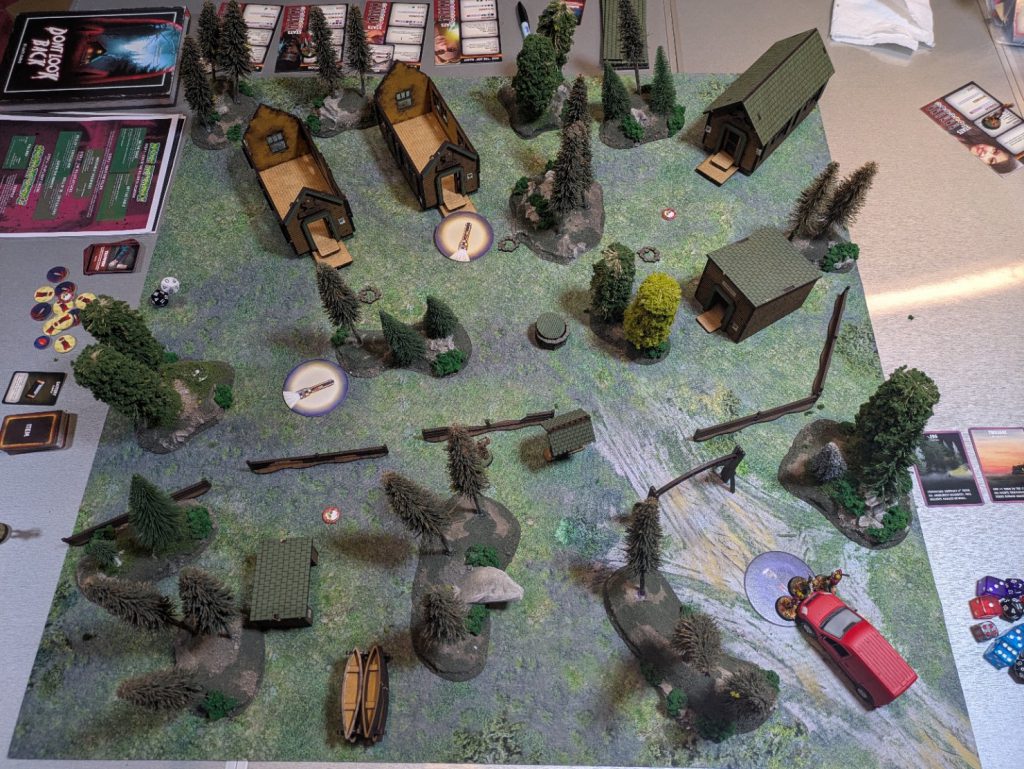 The Fright Phase was uneventful - we rolled low enough on the chart that they did not activate. All of the characters moved up toward the cabins in the top right of the picture above, but didn't have enough movement to get in. There are points of interest in there (dead campers) who might have the keys to the camp van.
