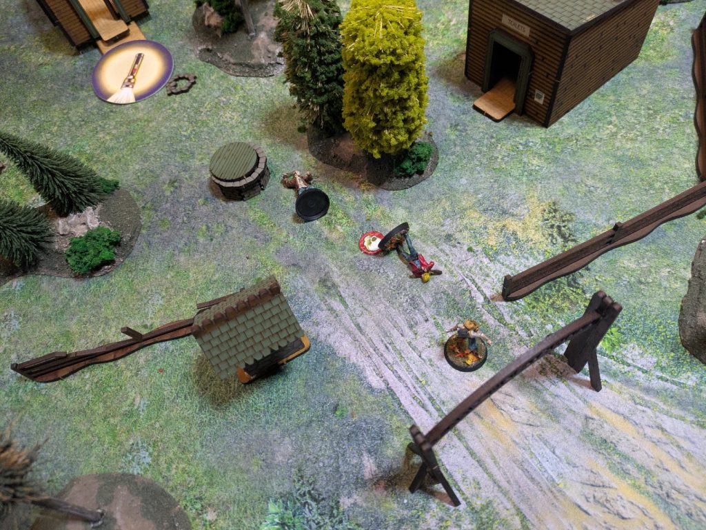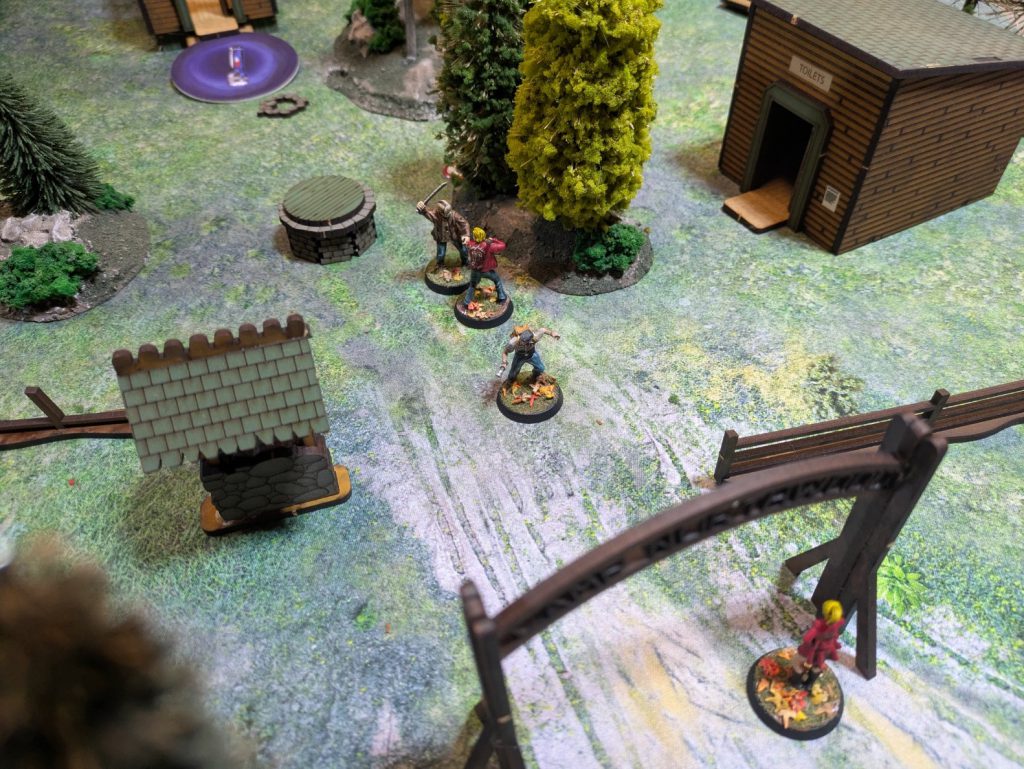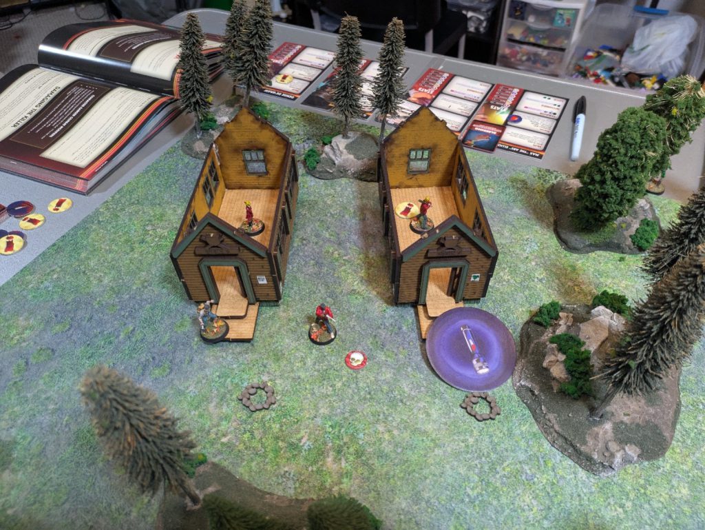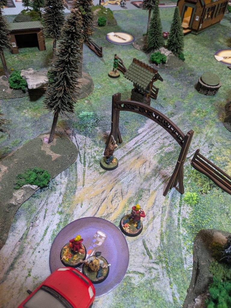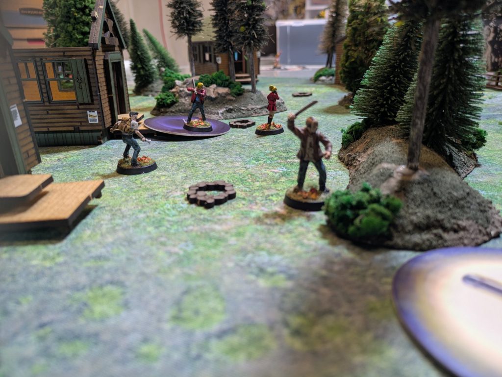 Totally disregarding Holden, Max sprinted toward the camp van. When you use two movement actions you have to roll a Trip test, and he passed. He used his skill Baby Blues to call Denise to him - clearly she couldn't resist being near the quarterback of the football team, and used a move action to run toward him. When she activated she kept running toward the car. Seth's movement is only 3" - so he's slower, but tried to keep up. Holden stumbled away from Jason (an action to do so), didn't trip, but didn't get far.