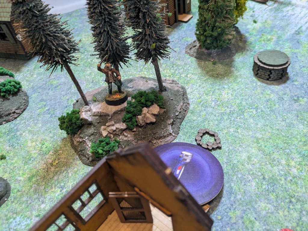 In the Fright Phase, the Fright token moved toward Holden and the other disappeared, Enraging Jason, adding +3 to his Critical Hit number. Jason ran toward Holden, since Holden had the most terror, adding +7 to his movement because that's how much Terror Holden had. He could not see Holden through the trees so he shot at Seth and missed.