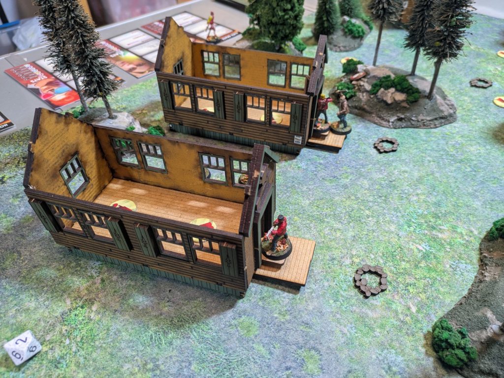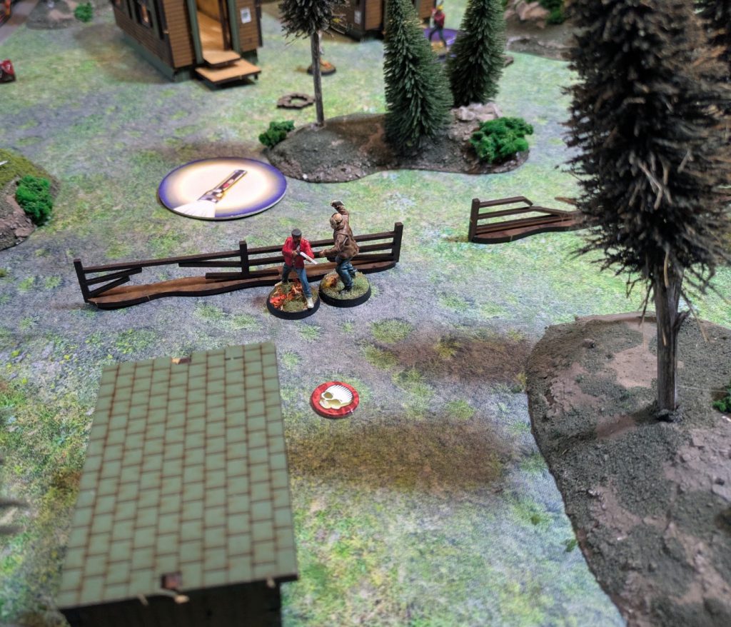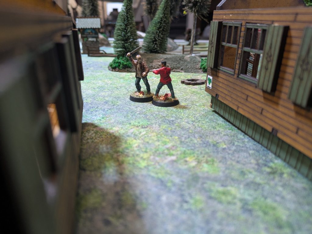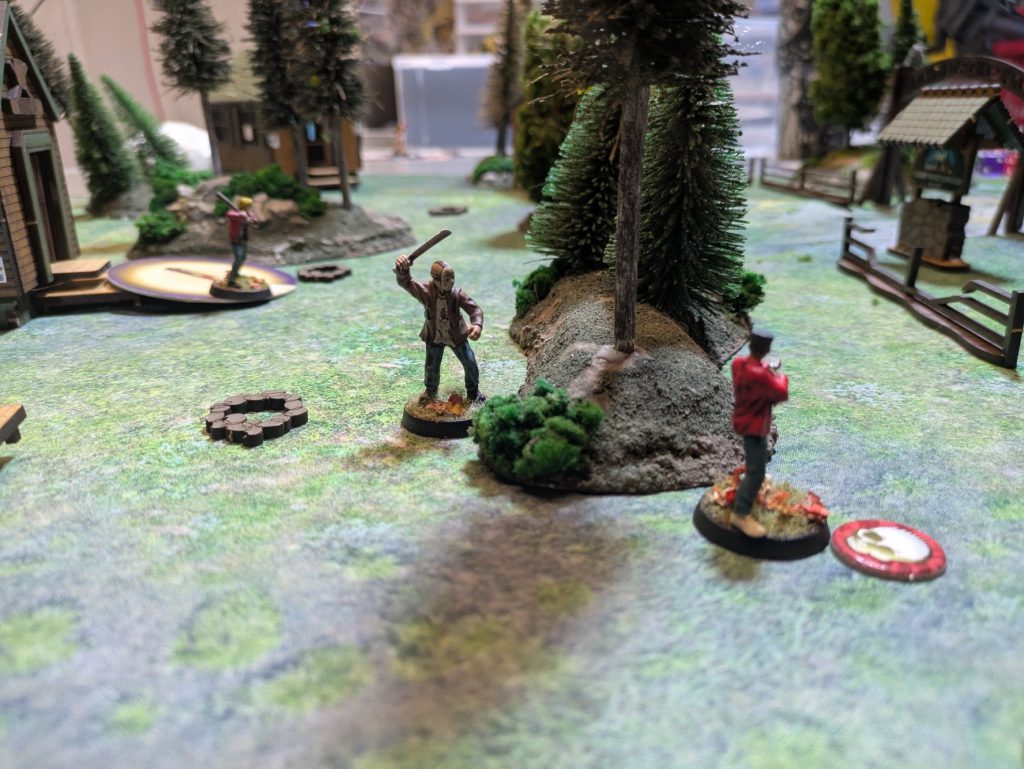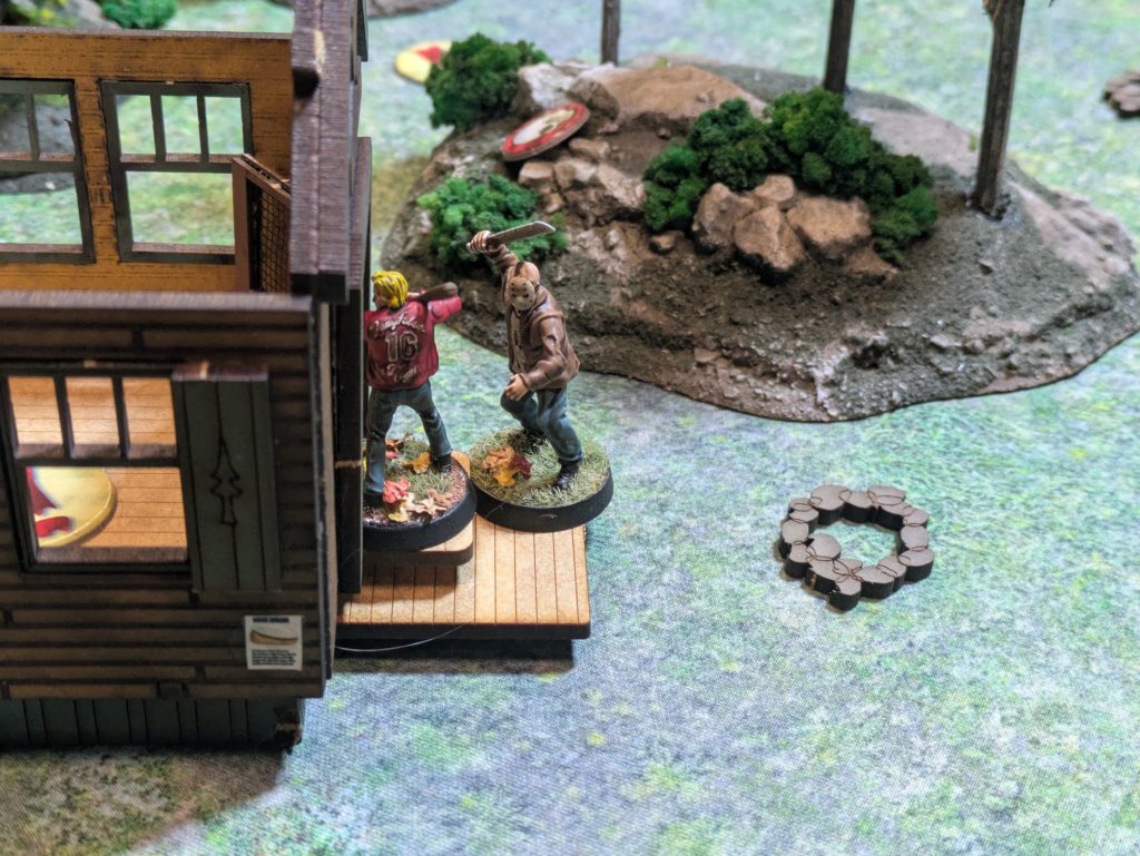 Holden then shot at Jason with his shotgun, actually hitting (+3 from encourage, +2 from Jason being in the light, -5 from shooting at a Killer engaged with a Character). This did two damage to Jason (the shotgun does D5 damage). After seeing Jason's visage in the light, he took one terror. Max did the same - took a point of terror from seeing Jason - then wound up and swung away with his bat, doing three wounds to Jason and pushing him back 2". Max then did a free action using one Luck (out of two) to heal 3 since he was in the light, and ran into the cabin to try to get away from Jason.