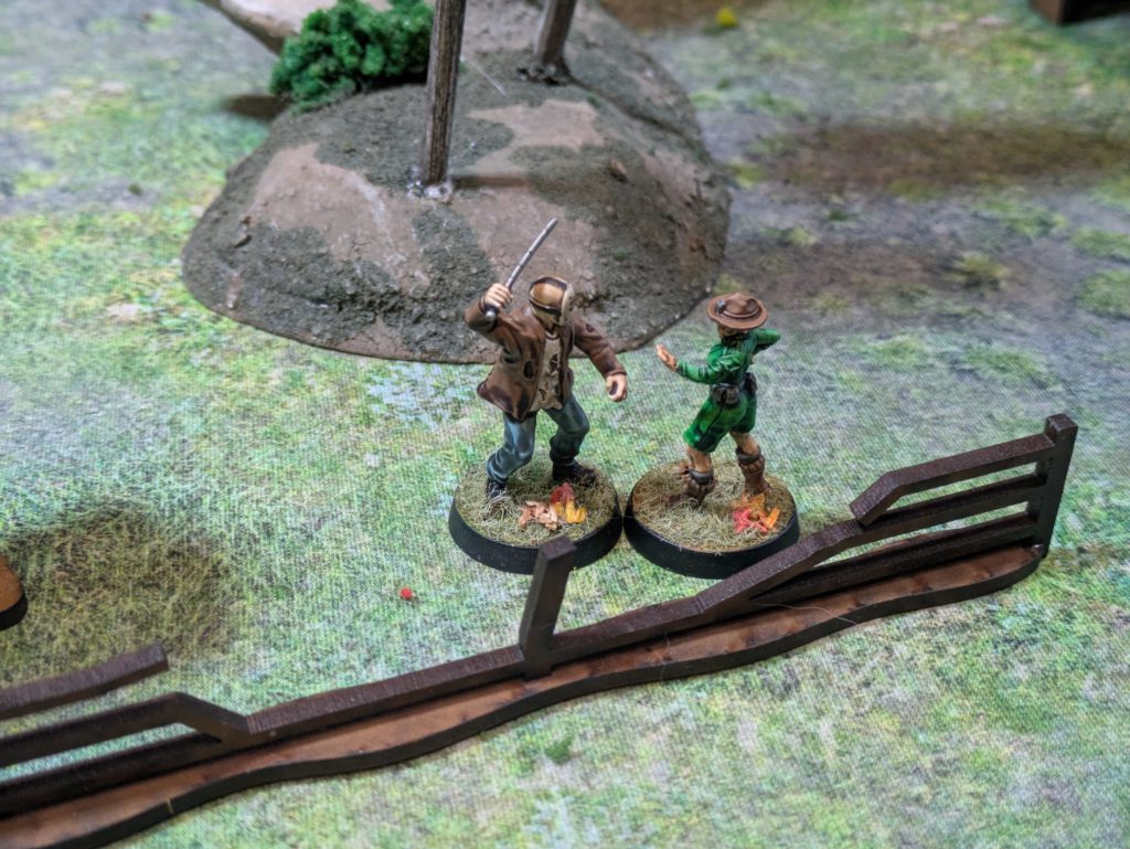 Seth did manage to stumble away, moving 2" away from Jason and passing his Trip test. He used his other action to Take a Breath, removing one Terror and one Wound. Denise shot at Jason with a revolver she had found with a search earlier, missing with the first shot but using a Luck reroll to actually hit, doing 3 damage. Max double moved toward Jason to make contact with him to try to save Seth. If Jason is in contact with another Character, he won't move to engage someone.