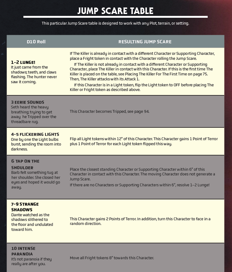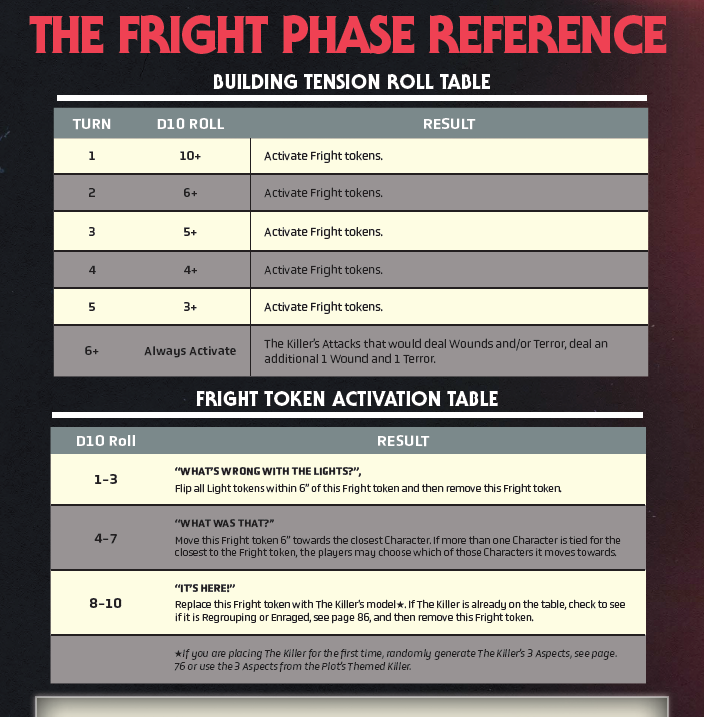 Each turn consists of the Fright Phase, Killer Phase, and Character Phase. During the Fright Phase, Fright tokens move around the board and might spawn the Killer or cause other isues for the characters. Fright tokens are abstractions of what happens in a horror movie - whispers in the dark, a crow suddenly cawing and flying away, or a door suddenly closing. This inflicts terror on the characters - one of the two pools of damage they can take (the other being Wounds).
