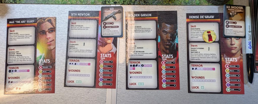 During the Character phase, the characters move around the board and collect information or equipment they need to escape. They can also attack the Killer and drive it off, if they do enough damage to it. The Killer will come back (of course), but they do get a brief respite. Characters will also do actions to manage their terror and wounds, call for backup (support characters - the people you see in movies who just pop up to try to help but become a target for the killer immediately) and other things they need to do to survive.