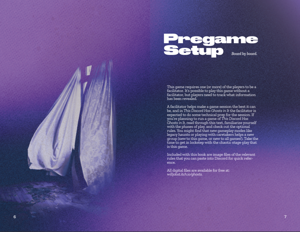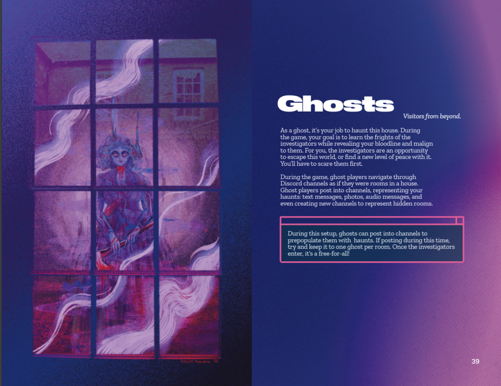 The result is a game that would look a lot like “This Discord Has Ghosts in it”: a roleplaying game designed to turn a Discord server into a haunted house adventure ride, and the members of the server into either the ghosts that haunt the house with unfinished business or the investigators trying to learn its macabre secrets.