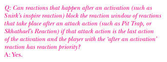 Reaction, you can choose to flip him to his inspired side after any activation. The ruling above makes it clear that this Reaction can be blocked via "After an Action" effects as well as other "After an Activation" effects. It also means that you can't Inspire Snirk in the same activation in which you play a card like Pit Trap