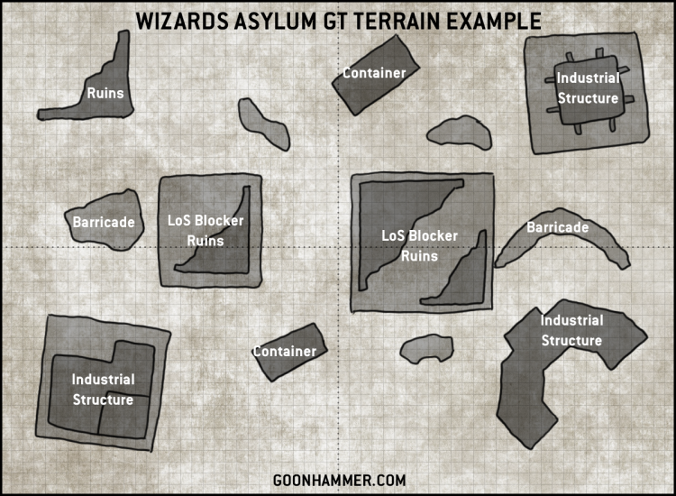 The first of our events on the 9th ed launch day, the Wizard Asylum GT used a mix of terrain types in what is visibly distinguishable as the standard tournament layout, but includes random placement of different obstacle or low ruin walls in addition to major anchor pieces. A mixture of obscuring/light (Ruins), and dense/heavy (Industrial) terrain elements as well as other elements commonly found in the GT packet.
