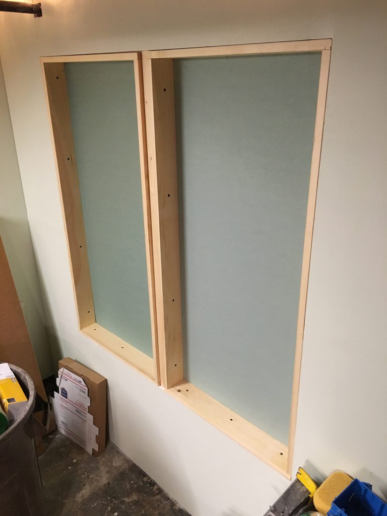After drywall, I used some 1x4s to trim it out the space and added shelves on metal shelf hangers.