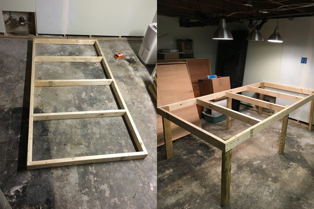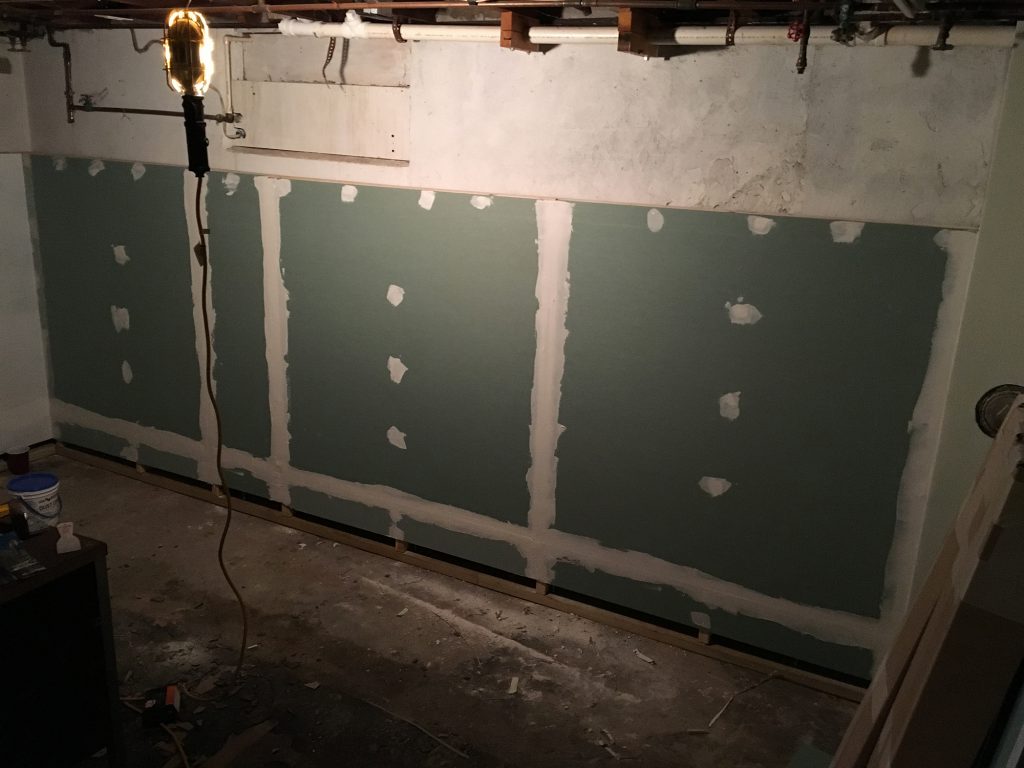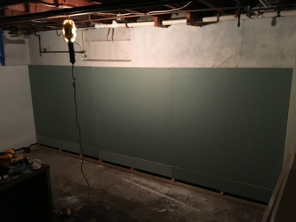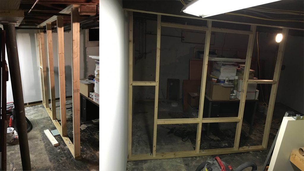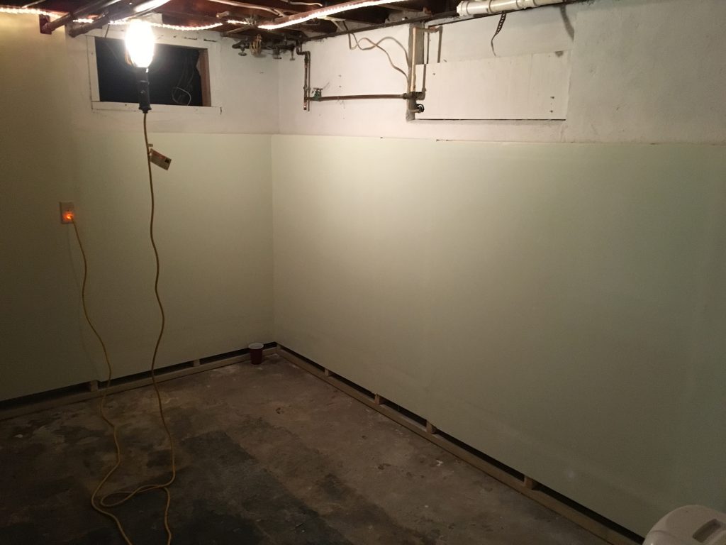 I made a few important design and material decisions at the outset of this project. I used pressure treated 2x4s for my footers to avoid any rot if there was moisture trapped under them. I made sure not to drywall to the floor, leaving about 4 inches of gap and left the top of the walls open and didn’t add a ceiling. That was more due to the fact that the ceiling was very low, but also I wanted to allow for air flow behind the wall to prevent mold. The gap at the floor was insurance against water intrusion, which thankfully never happened.