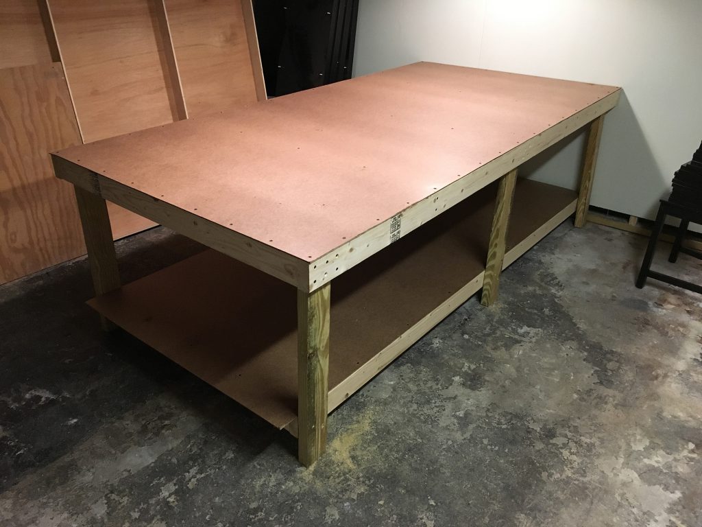 I also built my gaming table for that space and still use it to this day, having been disassembled to move it and blessed it with some upgrades over the years. I built the frame out of 2x4s and designed it with a shelf under it for storage. It's a full 4x8 feet in dimension, allowing for a 4x6 board to go on top with room at the ends for books, casualties and drinks.