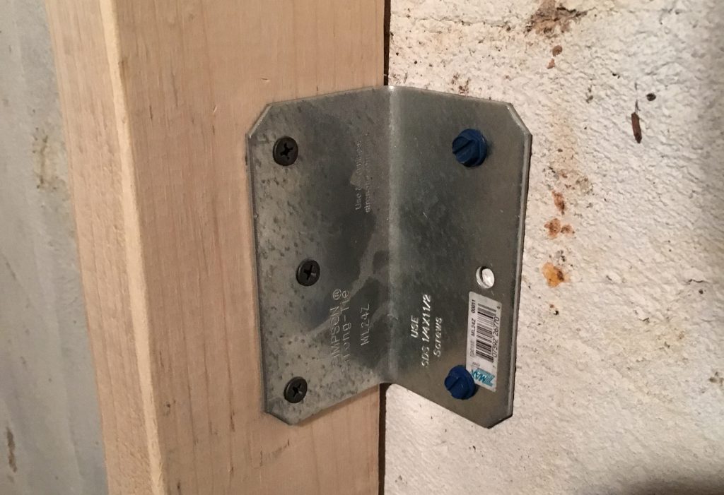For framing out the walls, I sunk concrete anchor bolts into the floor. I used a hammer drill to drill the holes and tapped the anchors in. With washers and nuts I bolted the footerss down. Due to the ceiling height, I screwed my header to the floor joists in the ceiling and then cut my studs to length and screwed them in place.