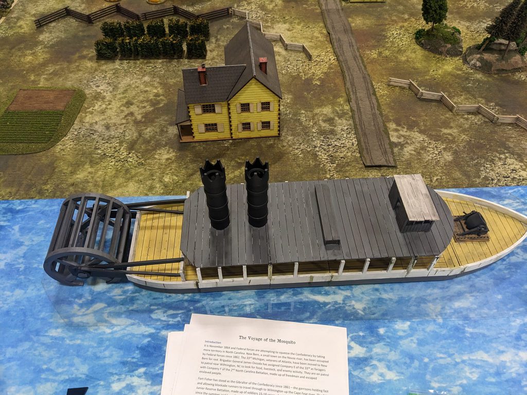 The 3D resin printed steamboat. Mugginns' Sharp Practice game at FlintCon.