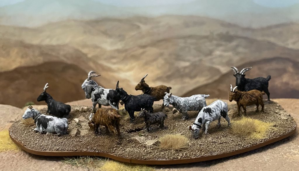 six goats. These are definitely my favourite goats I’ve seen available, they’re excellent sculpts, and highly accurate to the appearance of domestic goats. They look great on a multi-base if you're thinking of pillage, where a flock of sheep can best even the most terrifying warrior.