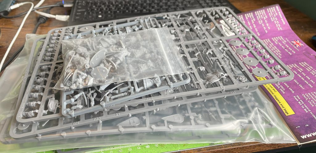 The baby is asleep, finally. Last night I laid out all the sprues I'd need - Victrix Normans and