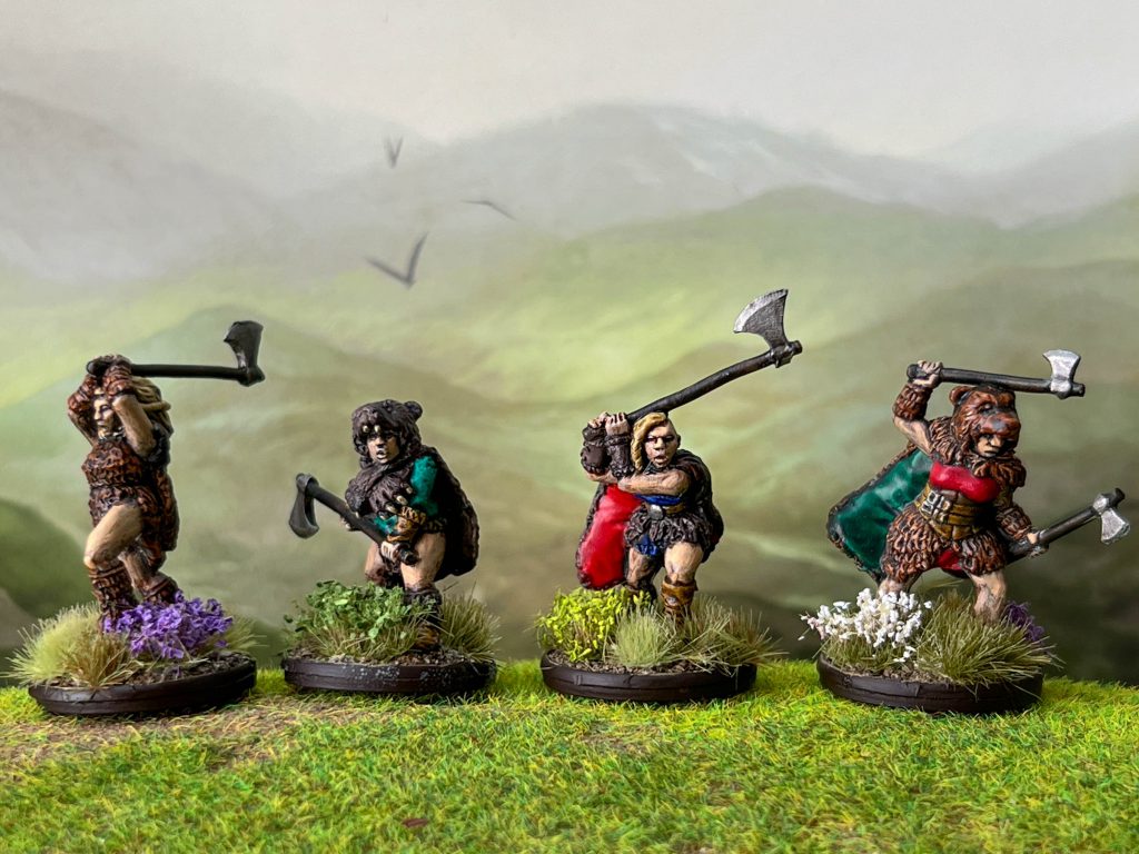 human minis like this (it's been a lot of dwarfs and Burrows & Badgers!) and they look great across the board. The only thing that I found a little odd is some of the faces under helmets felt a little flat, as in two-dimensional almost, but that might come from necessity of the sculpt for the sake of casting the minis. You'll notice similar needs in the general poses of the minis, the berzerker on the far right being maybe the most obvious in pose. One thing that I didn't really think would show through until I got to the end of the process but really love about these models is that the shields have the wood grain sculpted in.