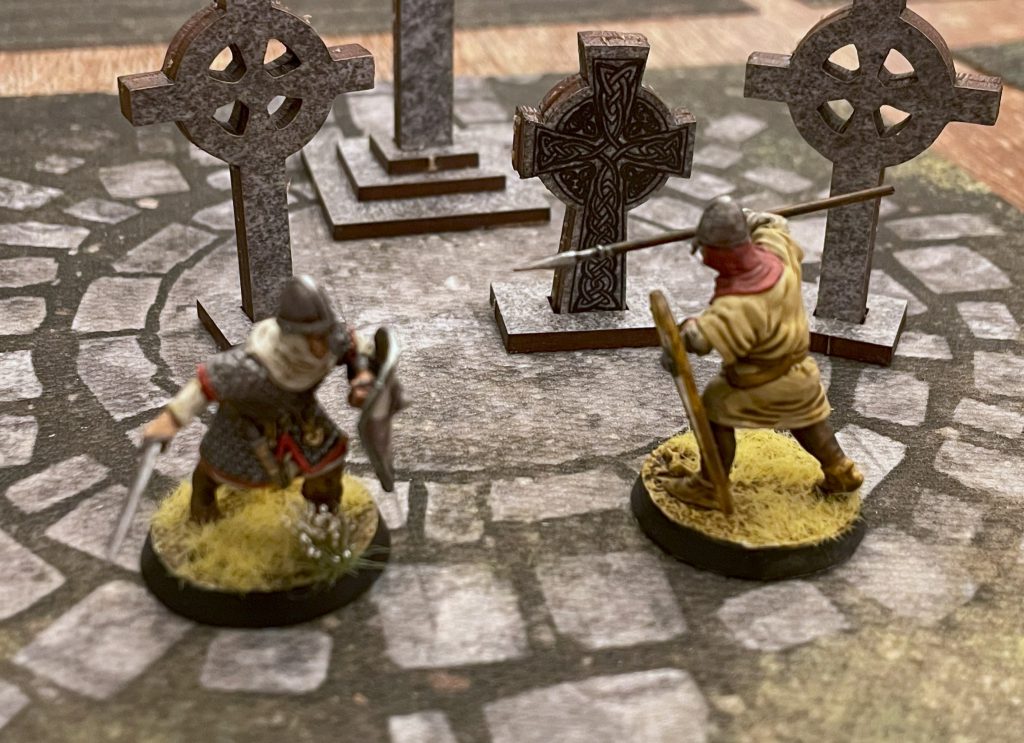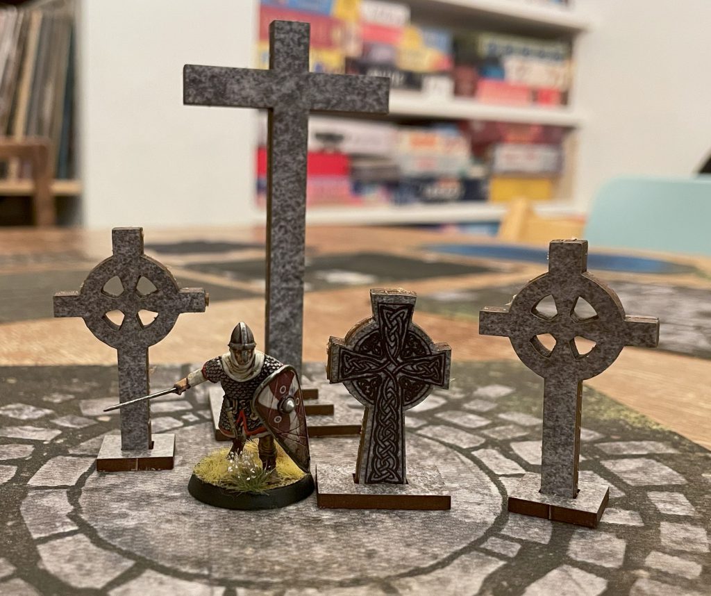Crosses Pack comes with four Celtic-style crosses and one large later medieval village cross, making for excellent scatter terrain for Vikings in Britain or other once-Christian lands. These are simple three part pieces - two sides for each cross and a base - with a good amount of detail in the printing. The larger cross isn't quite as nice as the three smaller ones, but they all look great and add a lot of character to a British or Irish themed board, especially alongside the Viking huts. I'd love to see Bandua take this kind of incidental Age of Vikings terrain further, with runestones and ogham printing in the same style.