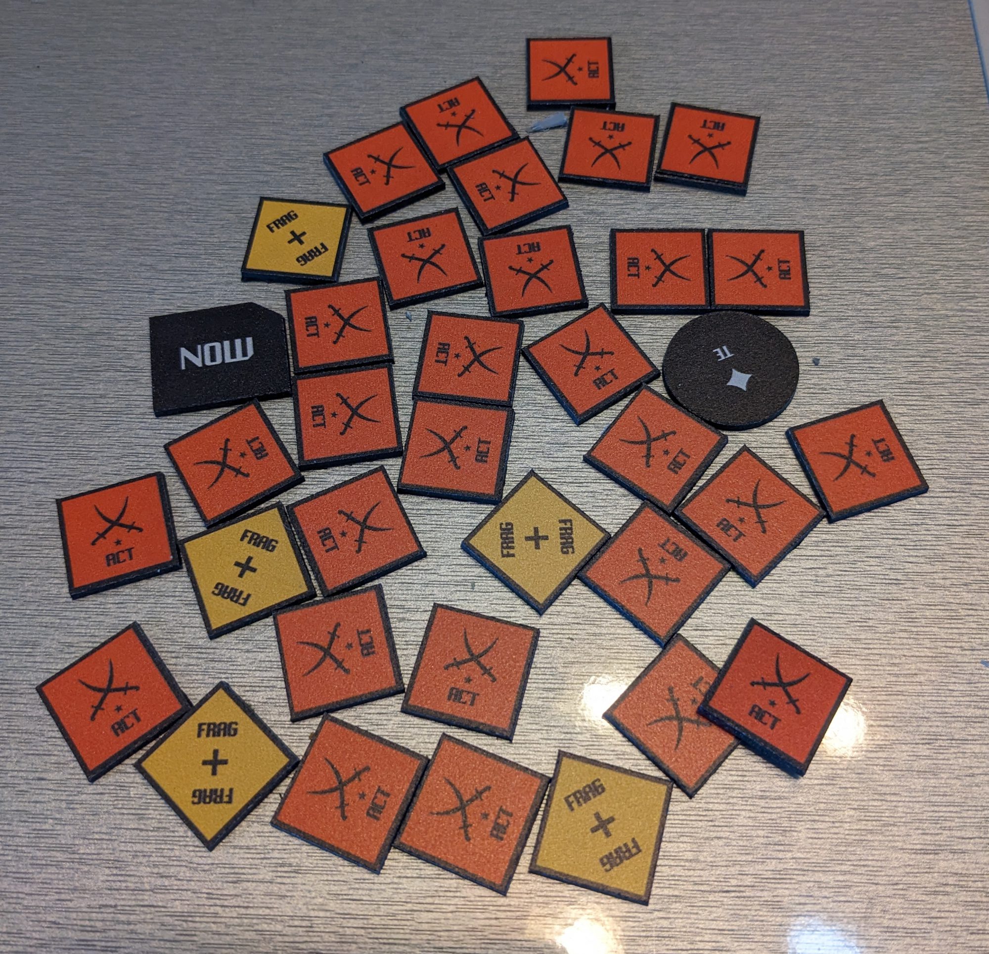 The tokens are made out of the same material the tiles are made out of. There is one turn marker, one turn counter, one objective marker (called TE or tactical exploitation - a phone, maps, photos, etc.), 5 frag markers, and 29 'act' tokens used to mark an activated fighter. Some of them have a little extra flash on them from when they were cut but its easy to remove that.