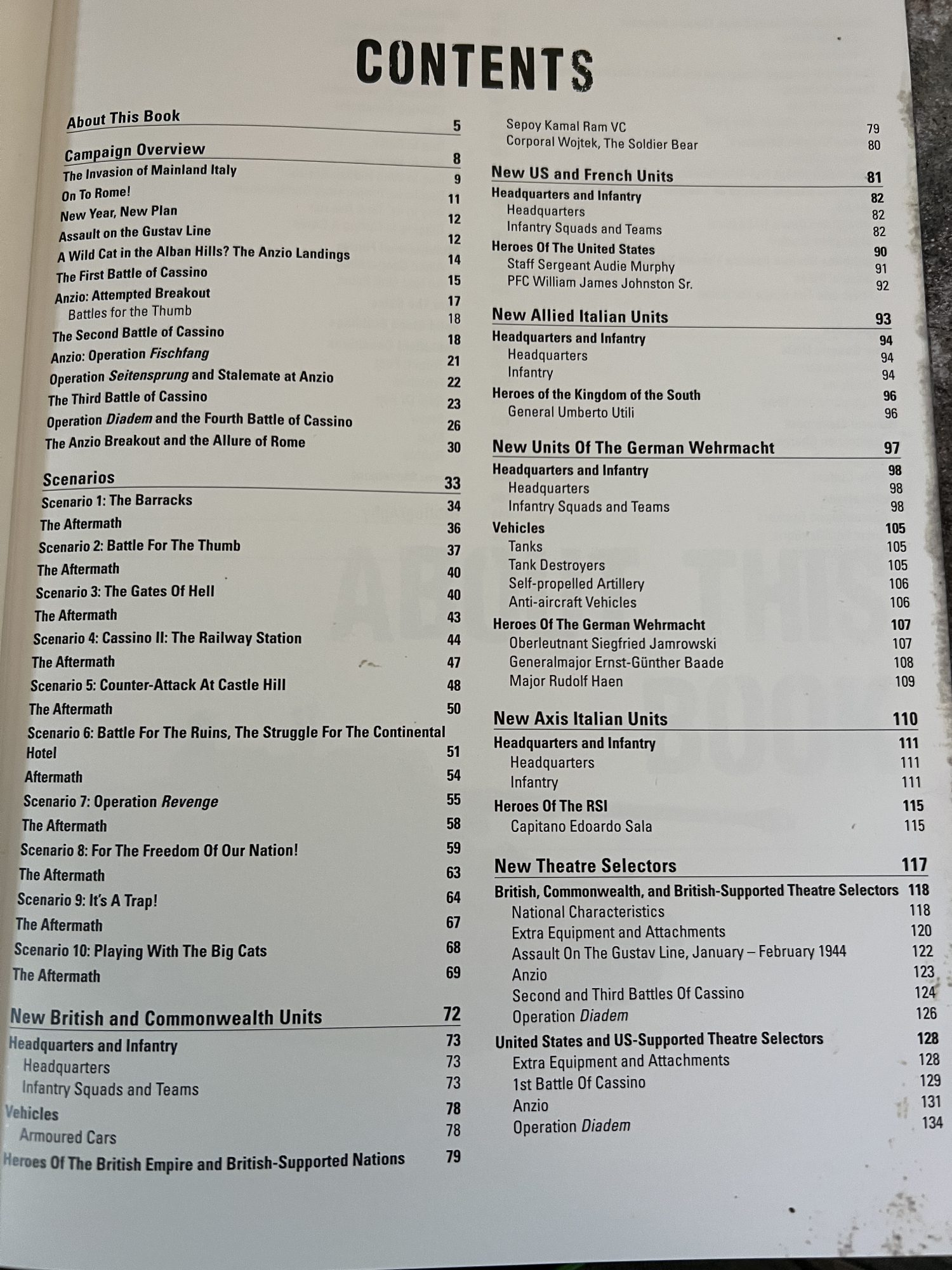 Despite this book only covering five months, it's a massive resource for Bolt Action players. The meat of this comes from the sections on New Units and New Theater Selectors. The British & Commonwealth, French, United States, Allied Italians, Axis Italians and Germans all get new units. In addition, some historical figures are presented as optional Heroic Units for some of the respective nations, such as the US getting Staff Sergeant Audie Murphy and the Italians getting Capitano Edoardo Sala.