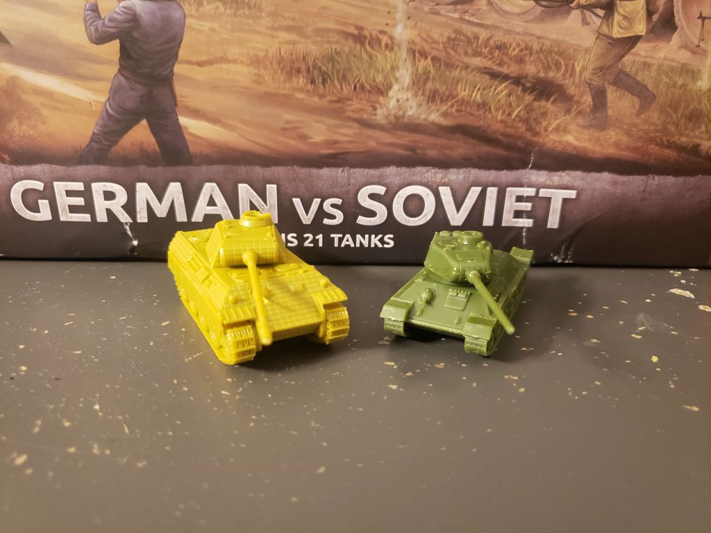 Kursk box is centered around an infamous tank battle, so it makes sense that it is an entirely tank-centric box, containing 21 tiny tanks, 14 for the Soviets and 7 for the Facists. The Soviet half has 7 T-34s, 3 Valentines, and 4 SU-85s. The German half has 2 Panzer IIIs, 2 Panzer IVs, 2 Panthers, and the contractually obligated single Tiger. It also contains a pocket sized rulebook that, near as I can tell, is the full rulebook for this game, a quick reference rulebook, and some really nice unit cards. There is a lot of value here for 65 dollars, though I do have a few complaints and nitpicks about a few things, mostly on the hobby end of things.