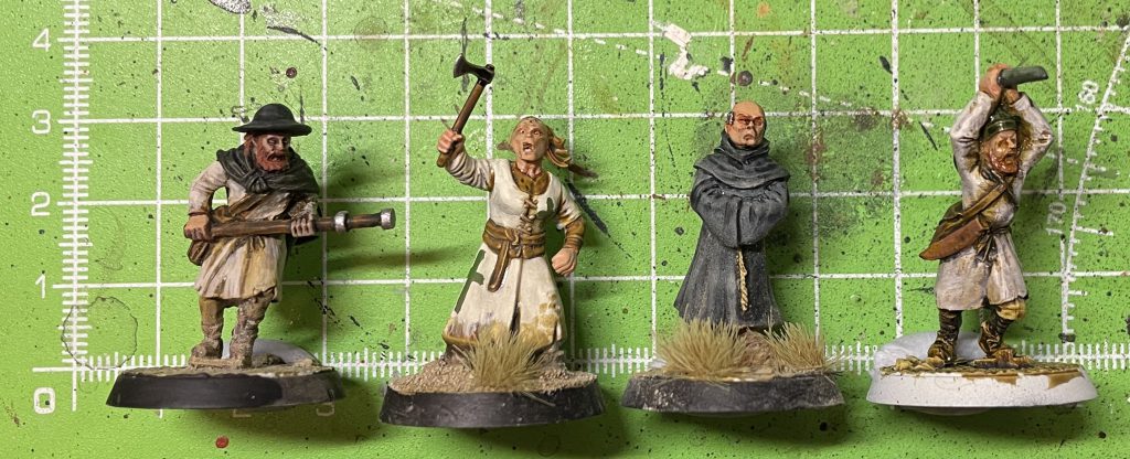 Pilgrim scale reference -Left to right: Footsore, Fireforge Peasant Rabble, 1st Corps Monk, Footsore. Footsore Barons' War: Outremer