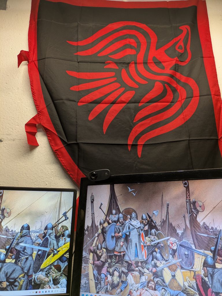 The raven banner hangs above my battlestation in the basement.