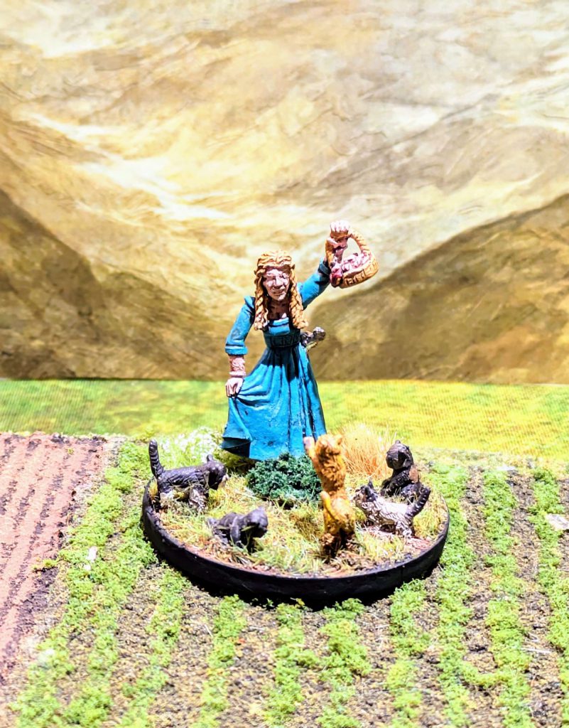 My daughter's hobby is cats, so I definitely had to get a mini for her with cats on it. Fish Lass Maria from Bad Squiddo is awesome - she's carrying some fish from the market while being harassed by a squad of cats and kittens. I gave her a scabbard and then painted each cat like a cat we have right now (three of them) and two who we had forever and passed on. She'll be the lead shieldmaiden for my daughter's warband, heading up the Warlord duties while fending off a passel of cats.