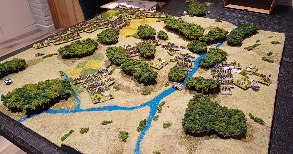In that respect, board and army size is completely dependent on which scenario you choose. Board size can be anything from 3x3 to a whopping 8x6. You’ll need about 25 to 30 bases of infantry for most battles, with assorted artillery, and a handful of general, cavalry and HQ bases. You control different corps in your army, made up of divisions, of which the smallest unit is a brigade.