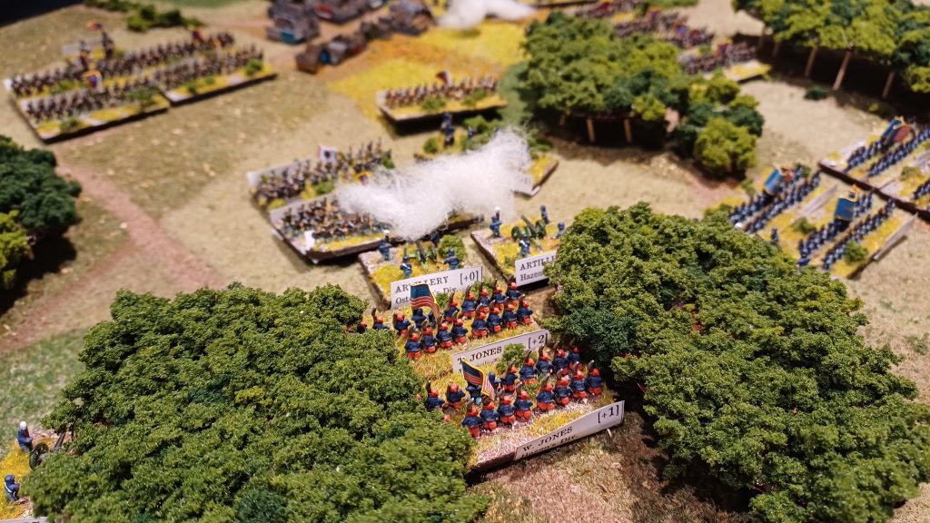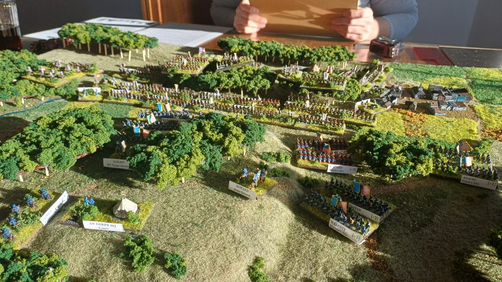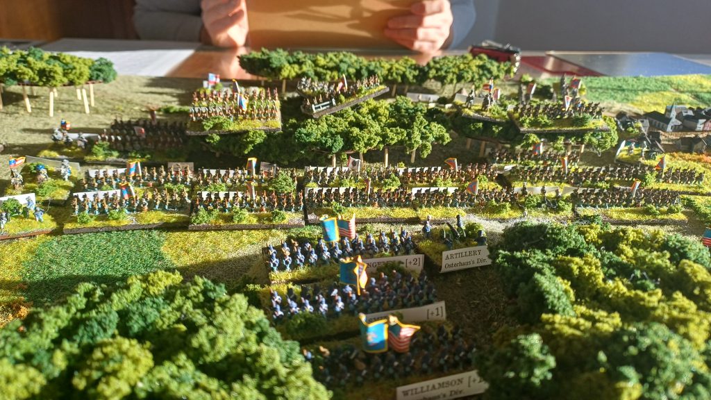 Since I’ve made the little Jonesboro board I’ve played the scenario three times, have assisted in another replay, and every time it feels different. After three times playing the Union side I am itching to try a strategy with the Confederates. Even with a vague knowledge of the disposition of the Confederate side in this scenario (very bad, low morale, but a numerical superiority) there hasn’t been a decisive win. Even though technically all the Union has to do is hold out, this is still a draw. Winning can be hard, even if you have better troops and a better deployment.