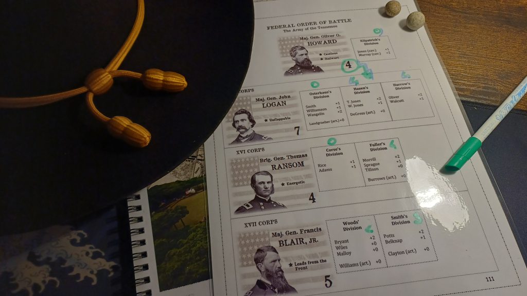 In the above shot, we have the Army of the Tennessee. General Howard has four points he can distribute across all other corps, while Logan, Ransom and Blair can only assign points to their own division. The division with four points will all act in the same bid, one after the other. So if these and any of your opponent’s divisions have activated, the bid ends and you both roll the d6.