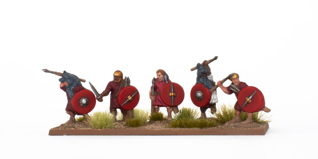 Next up to paint were some Roman Velites. These Caesar's Legion lookalikes are the Roman skirmishers, which means some freedom in how you put them on the base. When assembling these I noticed, there's more holes on the base than there are minis to put on it, so you'll need to do some gap filling there. I wanted to try out some different skin tones and some skin effects on these guys (as my elephant crew was all just white guys). I opted to also paint some of their tunics in different colors to add to their scattered nature as skirmishers. The biggest hurdle I faced when painting this unit was the wolf fur two of them are wearing, trying to paint a decent looking fur at that scale is really difficult