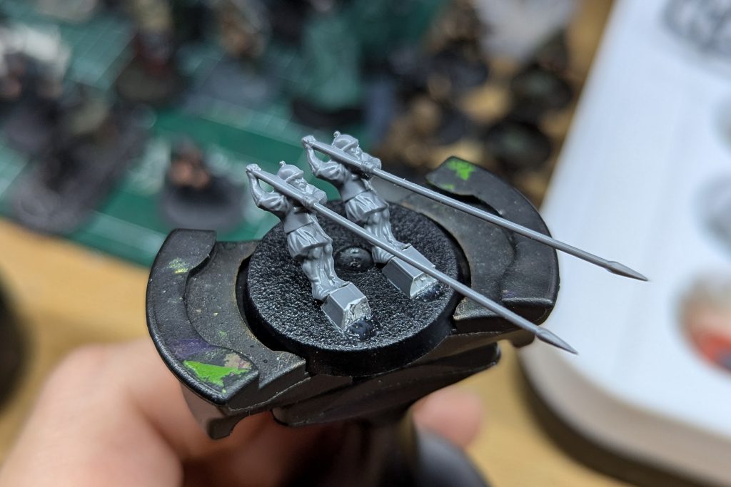 I originally intended to paint more than just three units, but seeing how I haven't really painted small scale before it was inevitable that I would run into some issues. My first project was obviously the elephants. When assembling them, it's smart to put them in sub-assemblies. As you can see on the photos, I assembled the elephants and their howdahs and then put each on their own temporary base. You can make use of their little peg and put it into a slotta base, while adding a little super glue to one of the other feet. The crew was a different story, while you could absolutely put them on temporary bases there's issues. The two pikemen obviously hold their spears lower than their feet, so I needed to angle them in a way that the spears wouldn't go below the base. For this I cut out two small pieces of sprue with an angle on one side and then put them on the base as shown below.