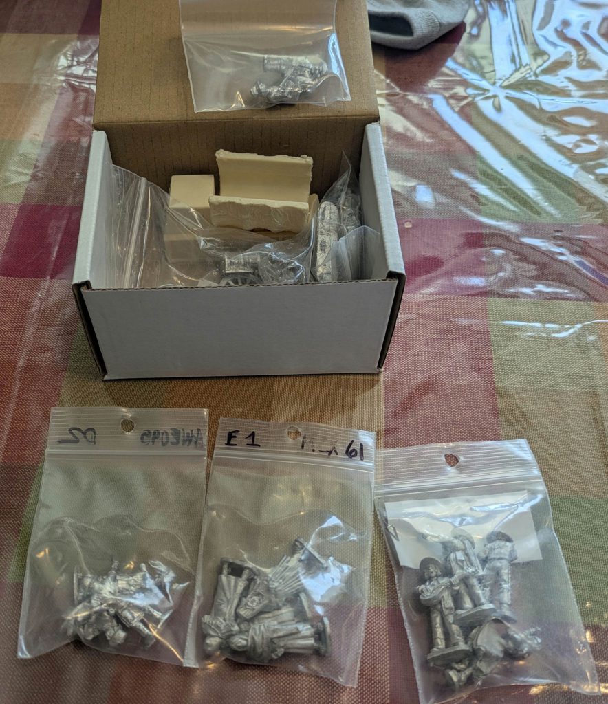 I picked up a chuckwagon from Brigade Games that I hoped to use for US-Mexican War but it turns out they weren't used until the 1880s - but it works great for Wild West. You know the minis are good when they're only labeled with a code. Credit: Mugginns