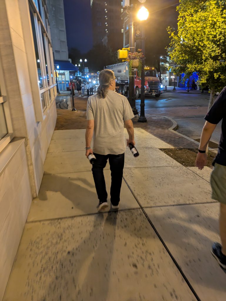 Our fearless leader, the Lard Uncle himself, Patrick, walks the mean streets of Lancaster double fisting bottles. Credit: Mugginns