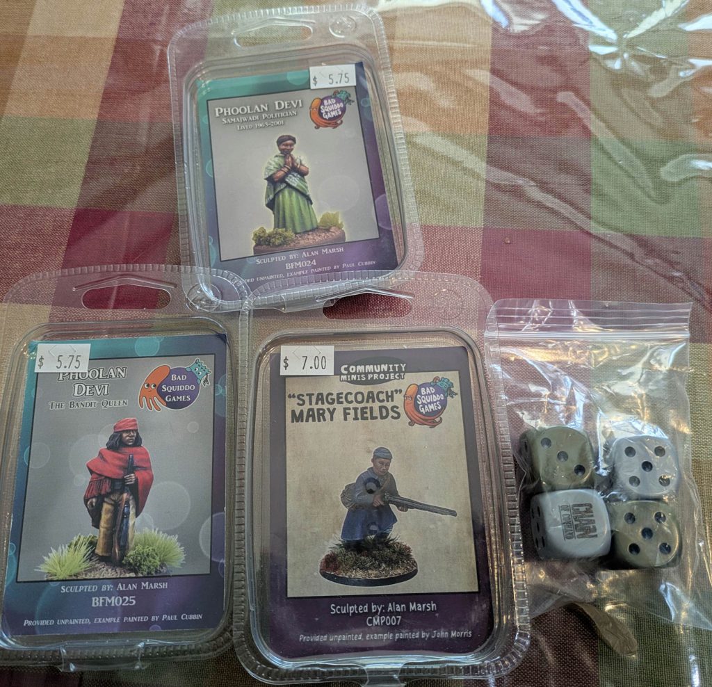 I grabbed some more Chain of Command dice from Age of Glory to use in my upcoming CoC games. Mary Fields will be great for Wild West games, while the two Phoolan minis will actually be used for my US-Mexican War games as Soldaderas - female soldiers and support staff who have a proud tradition in Mexican history. Credit: Mugginns