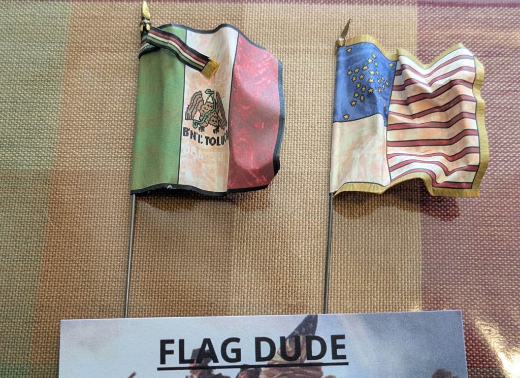 Flag Dude is a staple at HMGS cons; he sells flags like this, predone for $7 each. I grabbed one for my Mexican militia and one for my US militia. Credit: Mugginns