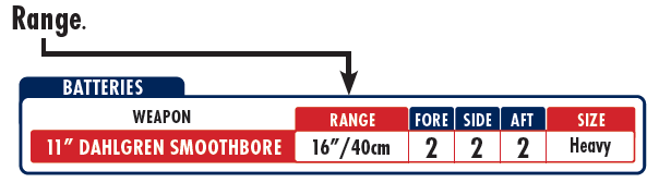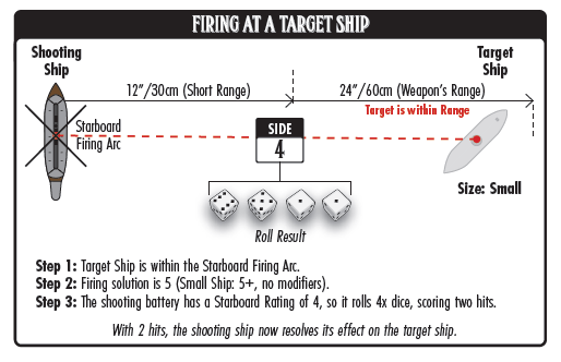 If the target ship is at speed zero it is considered Stationary and you subtract one from the hit number (ie. 5+ becomes 4+). If the target ship is within half range of the battery firing it is considered Point Blank, and again you subtract one from the hit number. If the ship is at long range (over the effective range) you add +1 for each 8" over the range (so at 6" over effective range, a 5+ becomes a 6+). Roll one die for each rating in the battery (for example, Fore 2 means you roll two dice). If you roll ahit then the enemy ship will have to save it or take damage.
