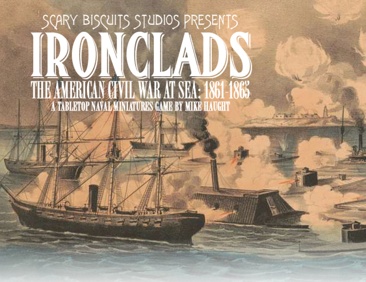 Ironclads is a 25 page ruleset that lets you re-fight riverine and ocean battles from the American Civil War using wood hulled ships, ironclads, tinclads, cottonclads, and forts. You can use just one ship or an entire fleet of a dozen ships. The game uses standard D6 dice, a 3x3 foot table, a bit of terrain (like islands or shoals), and some tokens you can print out. The great thing is that they're free.
