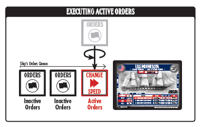 Players start each turn assigning orders to their ships. Orders allow players to do normally disallowed actions. Each turn your ship is going to move straight and you might get a 45 degree turn at the end. Orders allow you to turn at the start of your move, repair damage, evade, etc. There are eight possible orders, so they're easy to keep track of. Most ironclads will have a Command stat of one. This means you put one order into its queue at the start of the turn, and it does that order. If a ship has a command stat of two or three, it goes into a queue with a first-in-first-out system (the queue must be full at the start of each turn). This means ships with a higher command stat are essentially slower to respond to orders, and orders players have assigned last turn might happen this turn when players aren't as keen on them to happen.