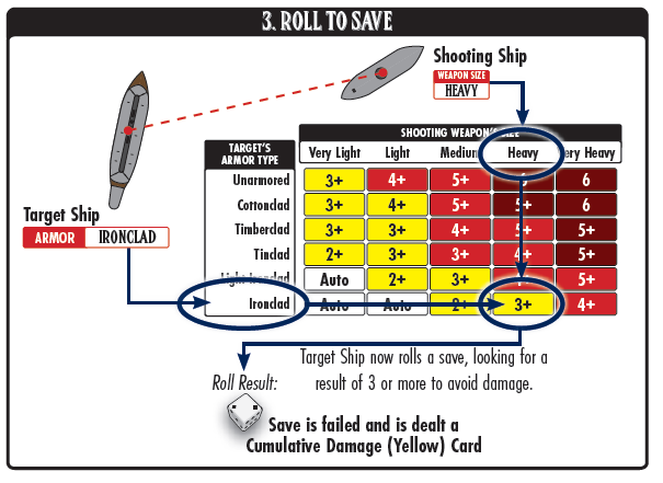 Index the Target's armor type vs the weapon's size and you get a save number. Predictably, heavier guns do more damage vs lighter armored targets. We actually had some trouble with this at first - I had lighter armored ships and my son had really heavy guns, while he had better armored ships and I had lighter guns - however there is a neat rule that if you get at Point Blank, you count your gun as one heavier type (you move to the right on the damage chart) and if you're at Long Range move one to the left. This means it's still possible for lighter armed ships to do damage if they get close.