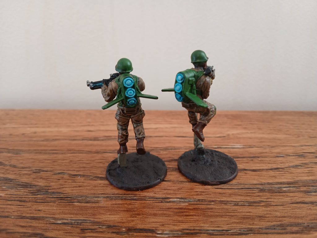 I decided to base my fireflies' colour scheme on the older M42 uniform, imagining them almost as test pilots. I used Field Drab for the uniform, and German Camo Bright Green for the jump pack, helmet and harness. They were pretty fun and easy to paint, and I'm looking forward to seeing how they play on the tabletop once I've got the rest of a US force built and painted.