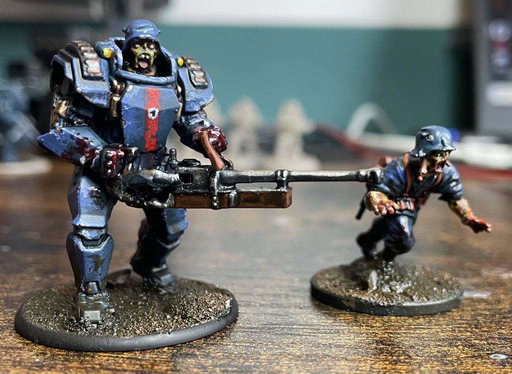I restricted my urge to convert things to a simple head swap, adding heads from the Wargames Atlantic Zombies to make these very dead Nazis. The paint scheme followed on from that, referencing the DC Horror Sgt Rock vs the Army of the Dead series with a strong blue with a lot of chipping and wear. I'll use these for end of level boss style enemies anywhere Nazi zombies are being splatted.