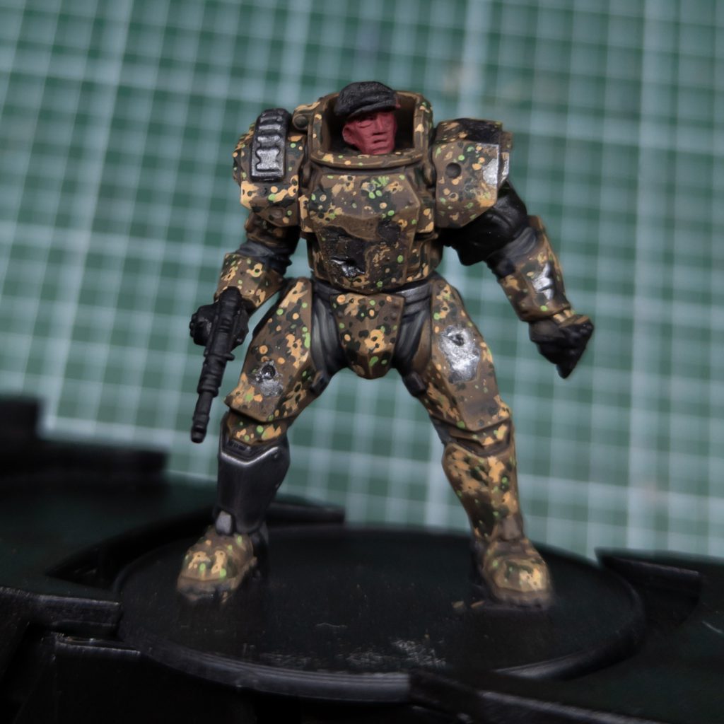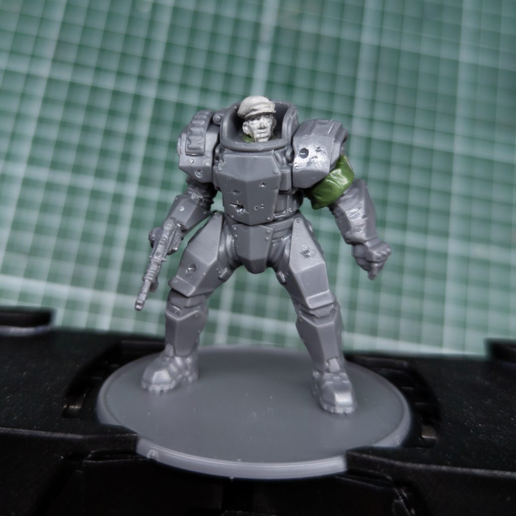 My plan for Konflikt is to assemble an Axis army that represents a cell of German and Czech resistance fighters wearing salvaged and stolen equipment. So obviously I could not assemble my first mini as it came out of the box, still I assembled most of it as was and that was a very enjoyable experience; the kit is very much in line with Warlord plastic infantry, you got a somewhat rigid body with some freedom in how you pose the arms. Additionally you get quite a handful of choices for both arms and heads, as well as two shoulder mounted weapon options which look sick. They also, as most modular plastic kits do, kitbash very well; you can swap out the heads no problem, remove extra details with a sharp knife and file (as seen on my example). You can see my guy has multiple perforated plates, is missing one of the lamps, the launcher rack on his right shoulder is gone and instead of the high caliber assault rifles is carrying a simple P-40.